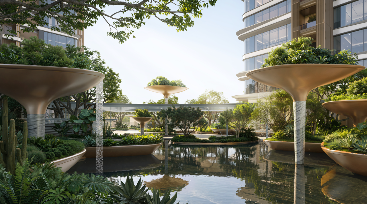 项目北侧窗前,骑龙绿轴公园的“无界绿廊”在眼前铺展;东侧门外,栏杆堰滨河公园的水岸绿道下楼即享。项目内部以索科特拉岛为原型打造“立体生态雨林景观”,与外部绿轴、滨河生态无缝渗透,形成连续生态界面,家仿佛从公园中生长而来。