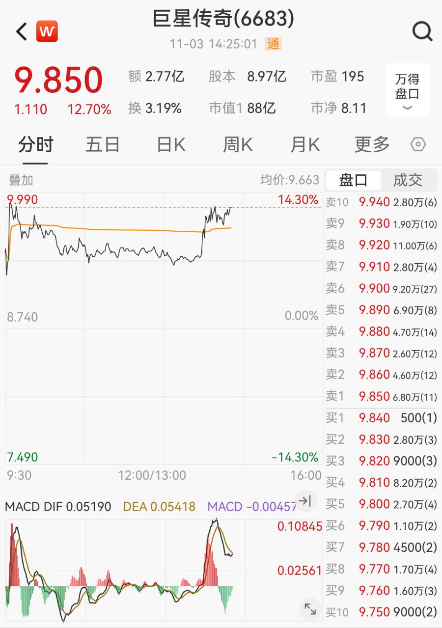 受此消息刺激,巨星传奇今日股价大幅高开,盘中涨幅一度达到14.3%,截至14时25分,涨幅仍维持在12.7%,报收9.85港元/股,市值达88亿港元。